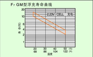 GM型充電電壓2.23-2.25V/單體,溫度在15-25℃時,壽命達15年見F7。