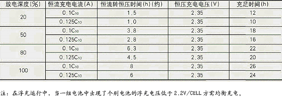 均衡充電采用先恒流,后按GM型2.35V/單體恒壓充電,充電時間取決于放電深度。見下表: