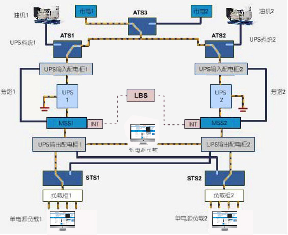為了消除可能出現(xiàn)在UPS并機系統(tǒng)輸出端與用戶端之間的“單點瓶頸”故障隱患,有必要配置UPS的雙總線輸出配電系統(tǒng)。其基本配置是由“N+1”型UPS冗余供電系統(tǒng)(優(yōu)選“1+1”或“2+1”型并機供電方案)+輸出配電柜+負(fù)載自動切換開關(guān)(STS)所組成的UPS輸出供電系統(tǒng)。對于某些要求較高的場所,還應(yīng)配置由負(fù)載同步控制器(LBS)+兩套“N+1”型UPS冗余供電系統(tǒng)所組成的具有較高“容錯”功能的供電系統(tǒng)。鑒于目前在IDC機房中所用的服務(wù)器和磁盤陣列機等產(chǎn)品中有(30~50)%為采用“雙電源輸入供電”體制的產(chǎn)品,對于這些設(shè)備,可以直接將分別來自兩套“N+1”型并機系統(tǒng)的電源連接到這種“雙電源輸入設(shè)備”的兩個輸入端上。對于采用“單電源輸入供電”方式的關(guān)鍵負(fù)載,則是將分別來自兩套“N+1”型并機系統(tǒng)的電源首先連接到“負(fù)載自動切換開關(guān)”(常見的是STS型的靜態(tài)開關(guān)和SS型的快速切換開關(guān))的兩個輸入端上,然后再將用戶的關(guān)鍵設(shè)備連接到“負(fù)載自動切換開關(guān)”的輸出端上。