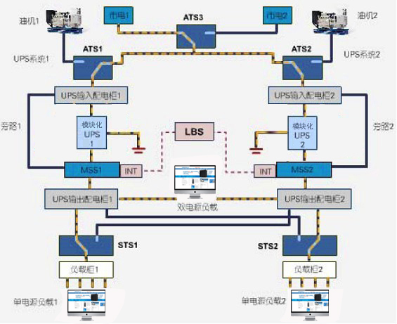 為了消除可能出現(xiàn)在UPS并機系統(tǒng)輸出端與用戶端之間的“單點瓶頸”故障隱患,有必要配置雙總線模塊化(N+X)UPS的輸出配電系統(tǒng)。其基本配置是由“N+1”型模塊化UPS冗余供電系統(tǒng)(優(yōu)選“1+1”或“2+1”型并機供電方案)+輸出配電柜+負(fù)載自動切換開關(guān)(LTS)所組成的UPS輸出供電系統(tǒng)。對于某些要求較高的場所,還應(yīng)配置由負(fù)載同步控制器(LBS)+兩套“N+1”型模塊化(N+X)UPS冗余供電系統(tǒng)所組成的具有較高“容錯”功能的供電系統(tǒng)。鑒于目前在IDC機房中所用的服務(wù)器和磁盤陣列機等產(chǎn)品中有(30~50)%為采用“雙電源輸入供電”體制的產(chǎn)品,對于這些設(shè)備,可以直接將分別來自兩套“N+1”型并機系統(tǒng)的電源連接到這種“雙電源輸入設(shè)備”的兩個輸入端上。對于采用“單電源輸入供電”方式的關(guān)鍵負(fù)載,則是將分別來自兩套“N+1”型并機系統(tǒng)的電源首先連接到“負(fù)載自動切換開關(guān)”(常見的是STS型的靜態(tài)開關(guān)和SS型的快速切換開關(guān))的兩個輸入端上,然后再將用戶的關(guān)鍵設(shè)備連接到“負(fù)載自動切換開關(guān)”的輸出端上。