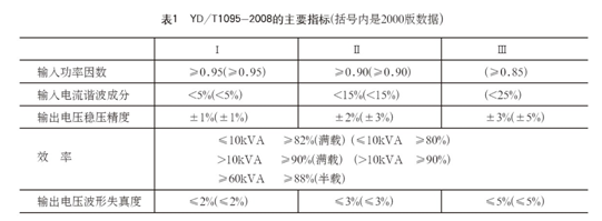 YD/T1095的第一版是2000年頒布實施的,為運營商選型提供了重要的質(zhì)量檢驗依據(jù),去年在總結(jié)多年應(yīng)用經(jīng)驗的基礎(chǔ)上,并根據(jù)UPS的技術(shù)發(fā)展和產(chǎn)業(yè)現(xiàn)狀,對YD/T1095-2000進行了修訂,YD/T1095-2008的主要指標(biāo)如表1所示。