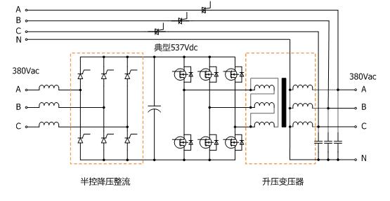 工頻機(jī)結(jié)構(gòu)UPS技術(shù)出現(xiàn)在上世紀(jì)70年代,因其整流工作頻率與電網(wǎng)頻率一致而得名。受制于當(dāng)時(shí)半導(dǎo)體技術(shù)發(fā)展,逆變器中IGBT器件耐壓只能做到600V,故母線電壓受限,逆變器輸出電壓不能做到380V;而且工頻機(jī)逆變器是全橋電路,輸出為三相火線,無(wú)法滿足單相IT負(fù)載和三相四線制負(fù)載的需求,必須進(jìn)行Δ-Y轉(zhuǎn)換。為解決這些問(wèn)題,廠家在工頻機(jī)逆變器輸出端加入了變壓器用于升壓和產(chǎn)生中線,以使輸出電壓滿足負(fù)載的要求,這便是工頻機(jī)內(nèi)置變壓器的真實(shí)目的。圖-1所示為工頻機(jī)的典型拓?fù)洹?/span>