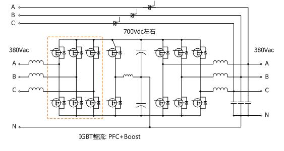 ????而到上世紀(jì)90年代,第三代溝槽型IGBT面世,其耐壓能力提升至1200V,促使了UPS技術(shù)的革新。通過(guò)整流側(cè)高頻升壓電路將母線電壓提升至700V左右,逆變器輸出電壓可以做到380V,輸出變壓器得以取消。而這種整流逆變電路都工作在高頻(幾kHz以上)且沒(méi)有輸出變壓器的UPS就被稱為高頻UPS。圖-2所示為一典型的高頻機(jī)拓?fù)洹?/span>