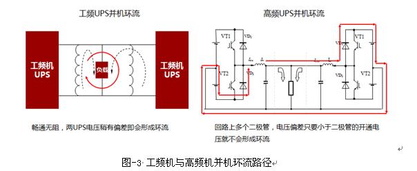 實(shí)際上,變壓器的設(shè)計(jì)反而增大了環(huán)流的風(fēng)險(xiǎn)。圖-3所示為兩類機(jī)型的環(huán)流路徑。工頻機(jī)UPS的并聯(lián)就是變壓器的直接并聯(lián),整條回路上沒(méi)有器件限制,電壓的偏差很容易產(chǎn)生環(huán)流。而高頻機(jī)的環(huán)流路徑上具備多個(gè)二極管,小于2V的電壓差根本形不成環(huán)流。