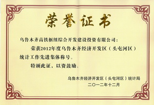 2012年12月,烏魯木齊高鐵樞紐綜合開發(fā)建設(shè)投資有限公司獲得經(jīng)濟(jì)技術(shù)開發(fā)區(qū)統(tǒng)計局頒發(fā)的統(tǒng)計工作先進(jìn)集體稱號。